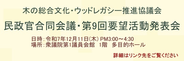 「日本産材の利活用による低炭素社会の実現」を目指し、政府・諸官庁に対して民間の立場から具体的な要望事項を継続的に発表している(一社)木の総合文化・ウッドレガシー推進協議会は、このたび第9回目となる「民政官合同会議・要望活動発表会」を開催いたします。